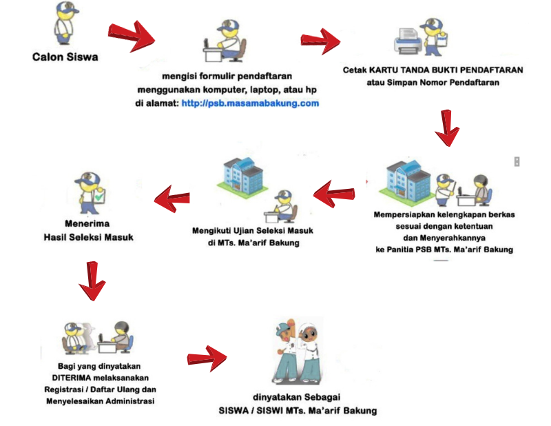 | 1. | Pendaftar datang ke MTs. Ma'arif Bakung pada tanggal pendaftaran yang telah ditetapkan atau langsung mengisi Formulir mandiri secara Online. |